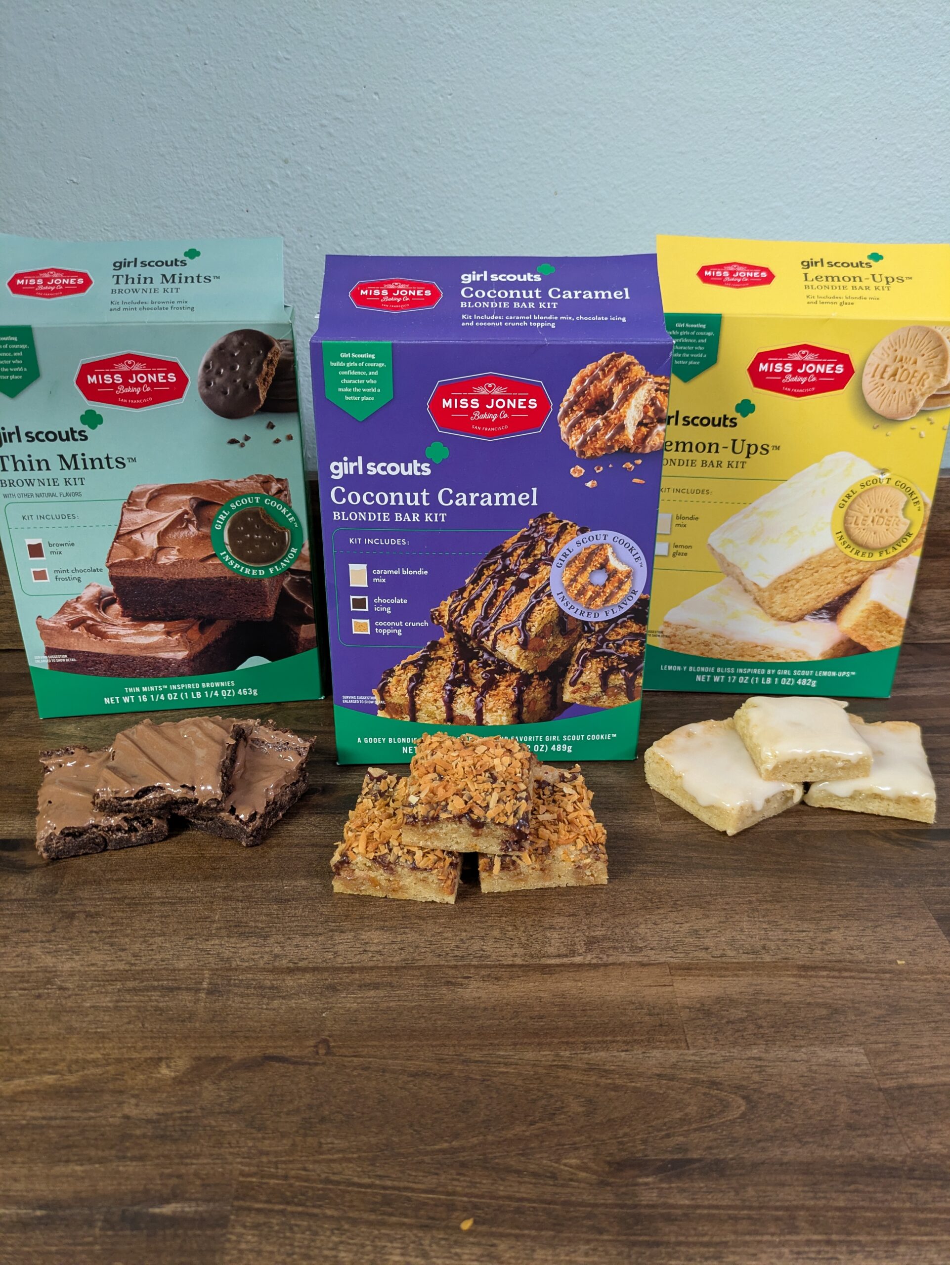 Months ago I heard about this new box mix line releasing and I have been dying to try them ever since. Miss Jones came out with a line of blondie box mixes that are inspired by Girl Scout cookies. When I finally saw them at my local Walmart, I took them home and immediately got to baking. I tend to go back and forth between which Girl Scout cookie is my favorite but it is always a toss up between thin mints and caramel delights (or samoas). Luckily for me, both of these flavors are included in Miss Jones’ blondie box mixes as well as the “lemonades” cookie. Today we are going to try out the coconut caramel blondie box mix inspired by caramel delights.